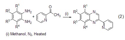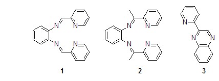 邻苯二胺与2-吡啶甲醛反应时得到的是n4席夫碱配体1[1],但是当把2-吡啶甲醛换成2-乙酰基吡啶时,以氯甲酸甲酯为催化剂,在异丙醇中反应没有得到相应的n4席夫碱配体2,而是得到了苯并六元环产物即2-(2′-吡啶基)喹喔啉3[2]。