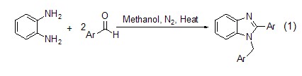 邻苯二胺和两当量的芳香醛在甲醇中反应时,生成相应的五元氮杂环的苯并咪唑衍生物 (式1)[3]。