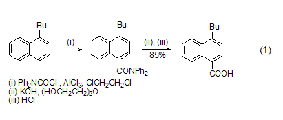 羧基的引入 在alcl3催化下,dpc-cl 可在芳环上引入一个羧基。烷基或烷氧基取代的芳环容易发生反应。产物二苯基酰胺用碱水解,再酸化可得到羧酸 (式1)[1]。