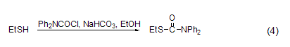 与巯基的反应 在碱性条件下 (如nahco3),在乙醇溶液中dpc-cl可与硫醇反应 (式4)[8]。