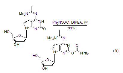 用作寡聚核苷酸合成时的保护基 在合成寡聚核苷酸时,鸟嘌呤核苷的碱基容易发生副反应,需要加以保护,dpc-cl可以将鸟嘌呤碱基的烯醇异构体酰基化而对其进行保护,这种方法在合成具有鸟嘌呤碱基和与鸟嘌呤碱基类似的核苷化合物时[9~12],发挥着重要作用 (式5)。
